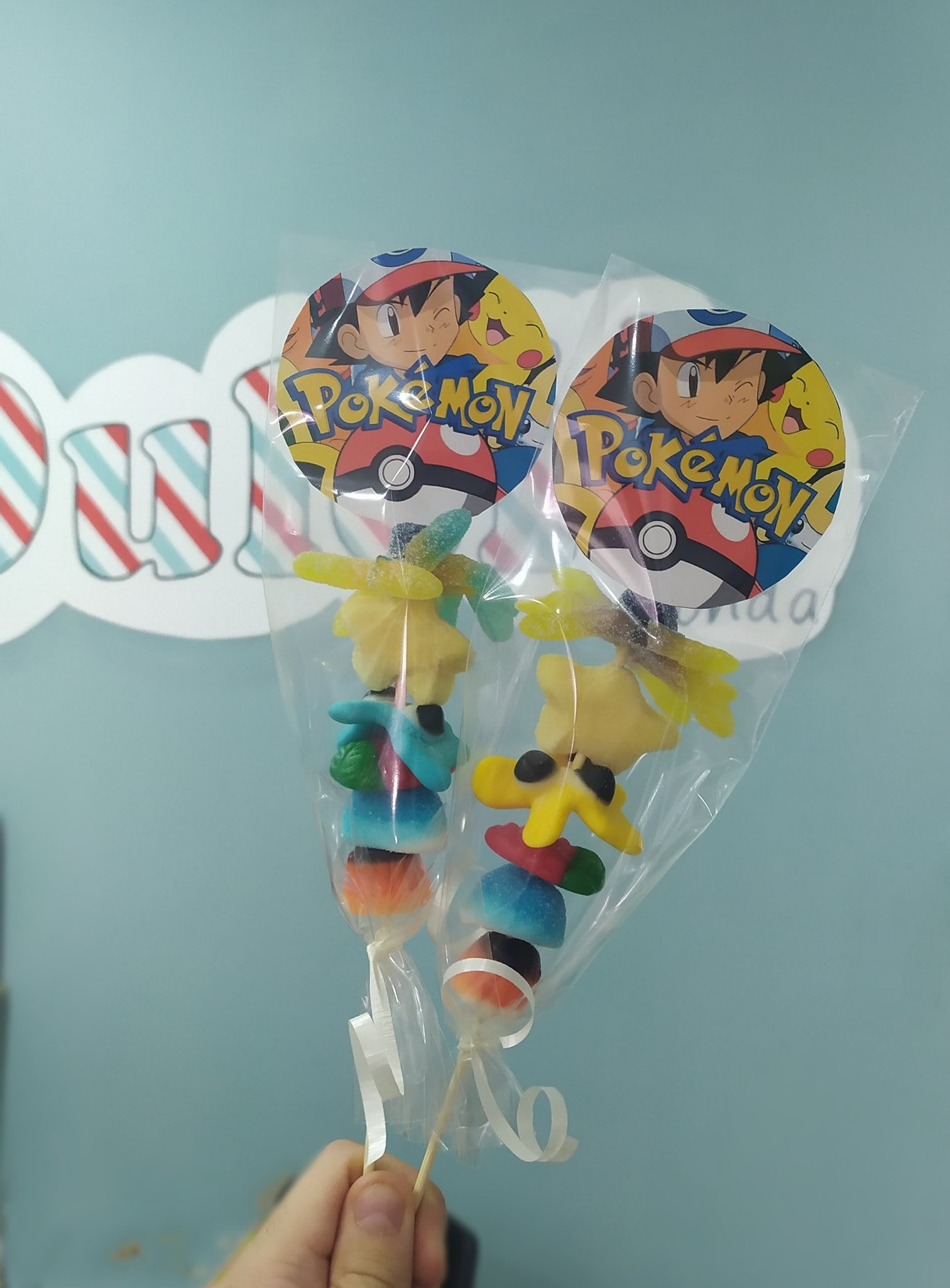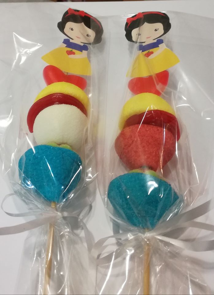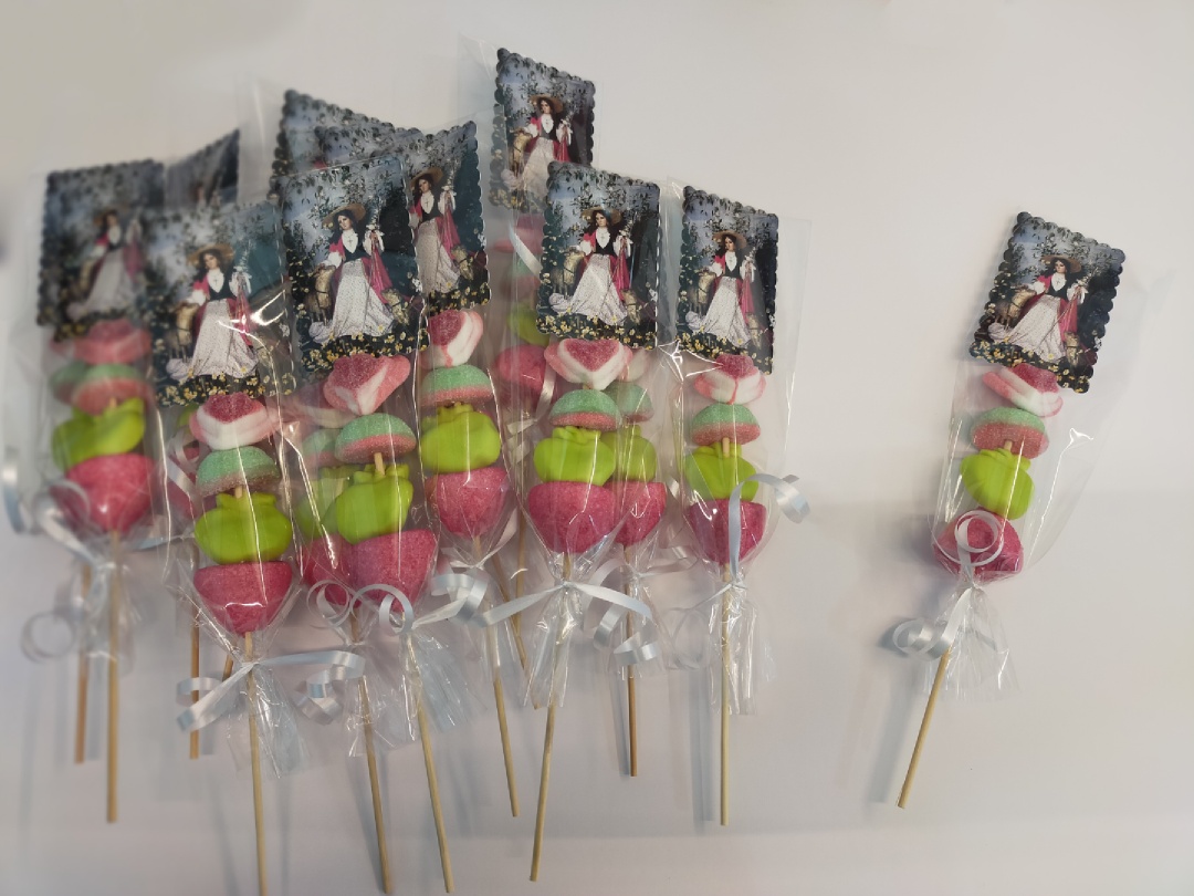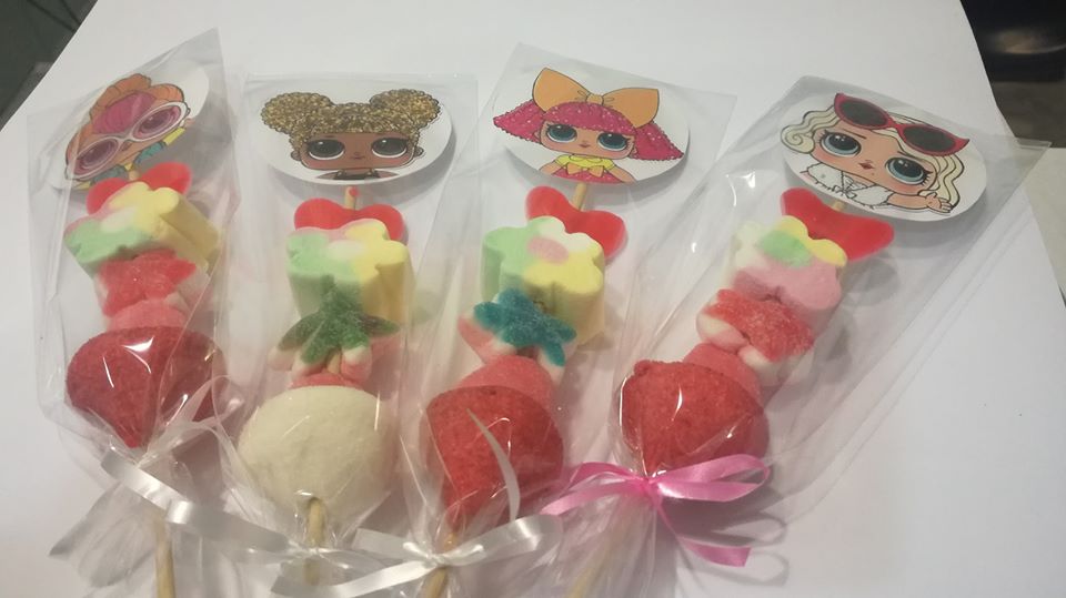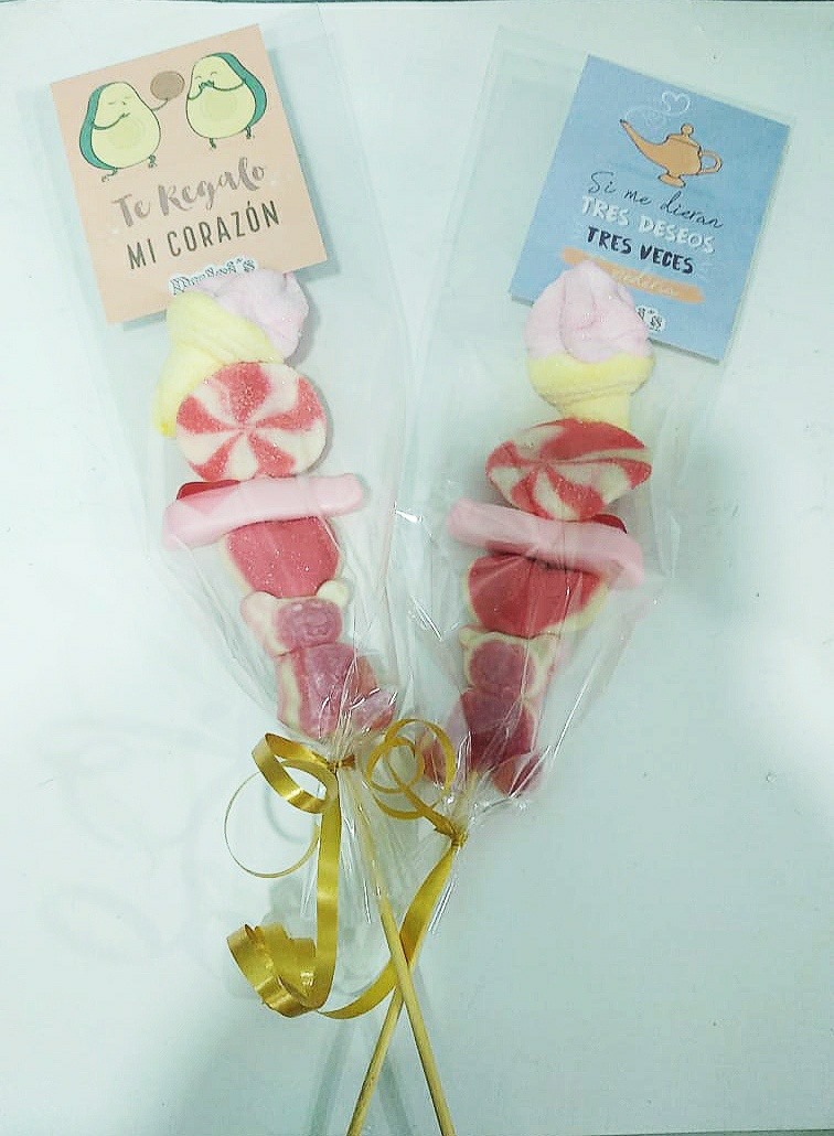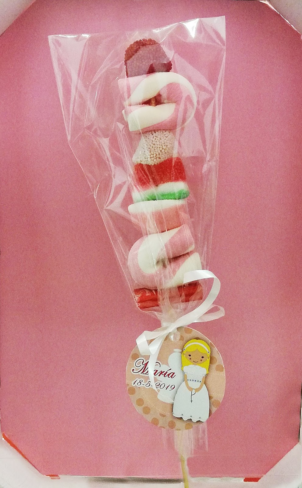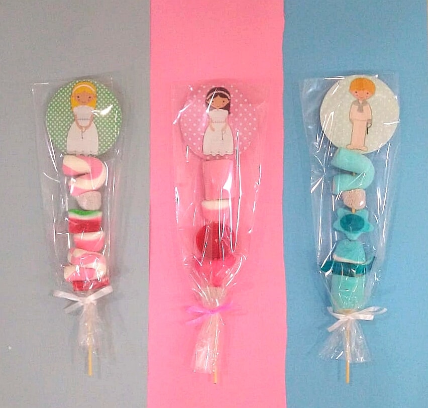 No pueden faltar en ninguna fiesta unos detallitos de chuches, brochetitas o chocolatinas personalizadas. Sorprende a todo el mundo con unas deliciosa y vistosa brocheta de chucherías totalmente personalizadas. Aquí tienes algunos modelos que hemos realizado, pero podemos hacerlo como más te guste. Podemos crear con ellas ramos, recrear animales o construir una combinación de colores a juego con tu evento, logotipo, etc…