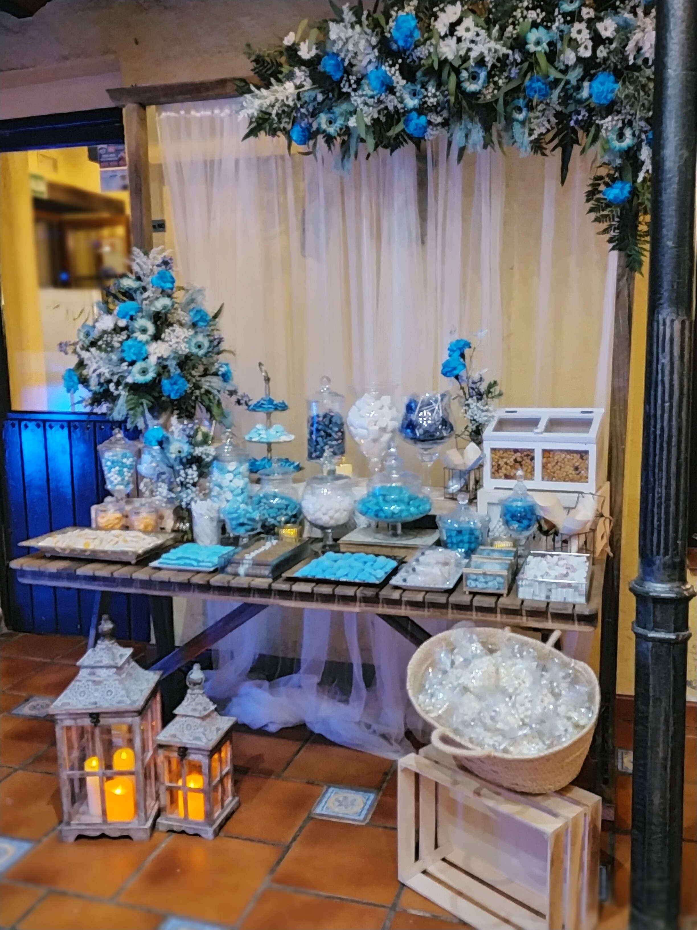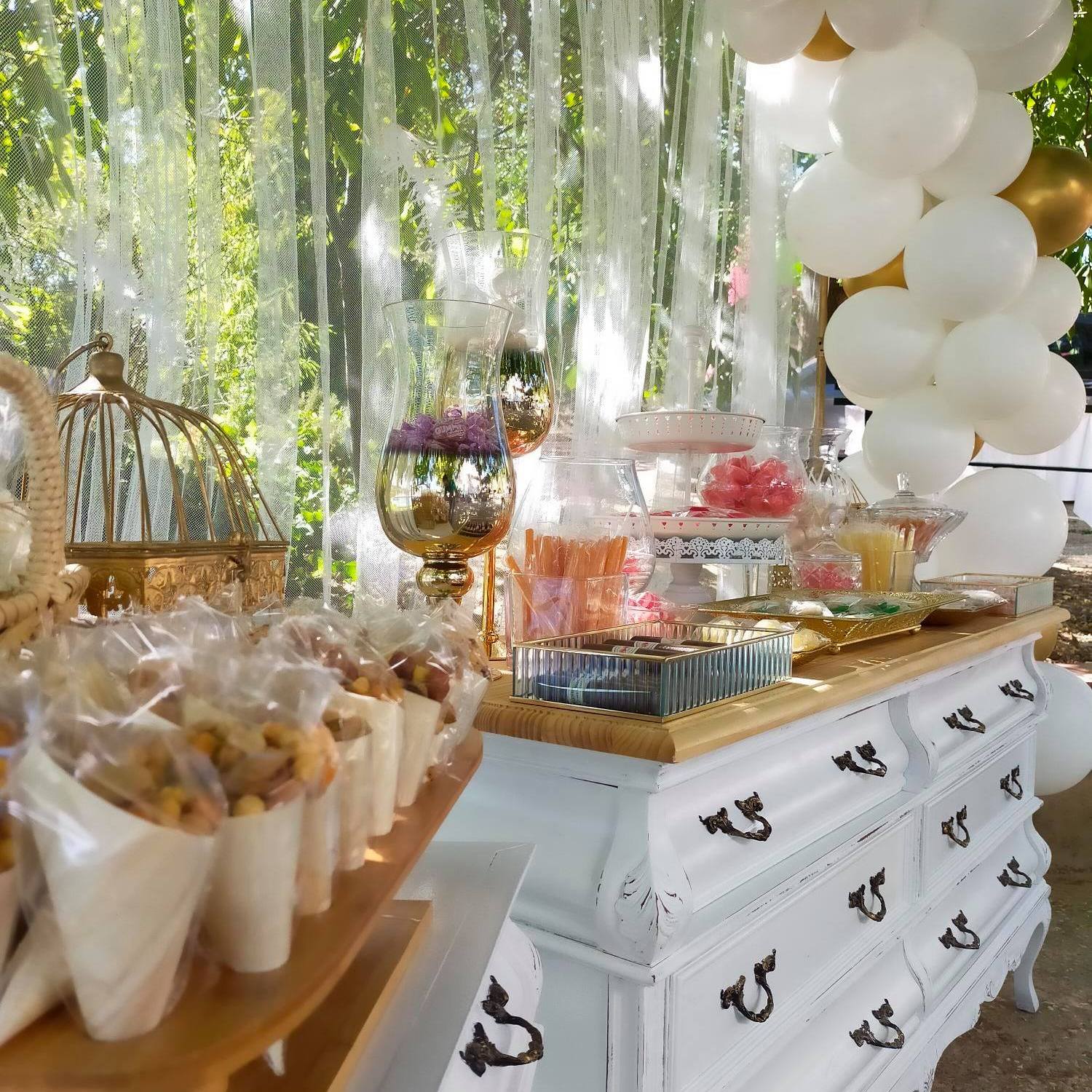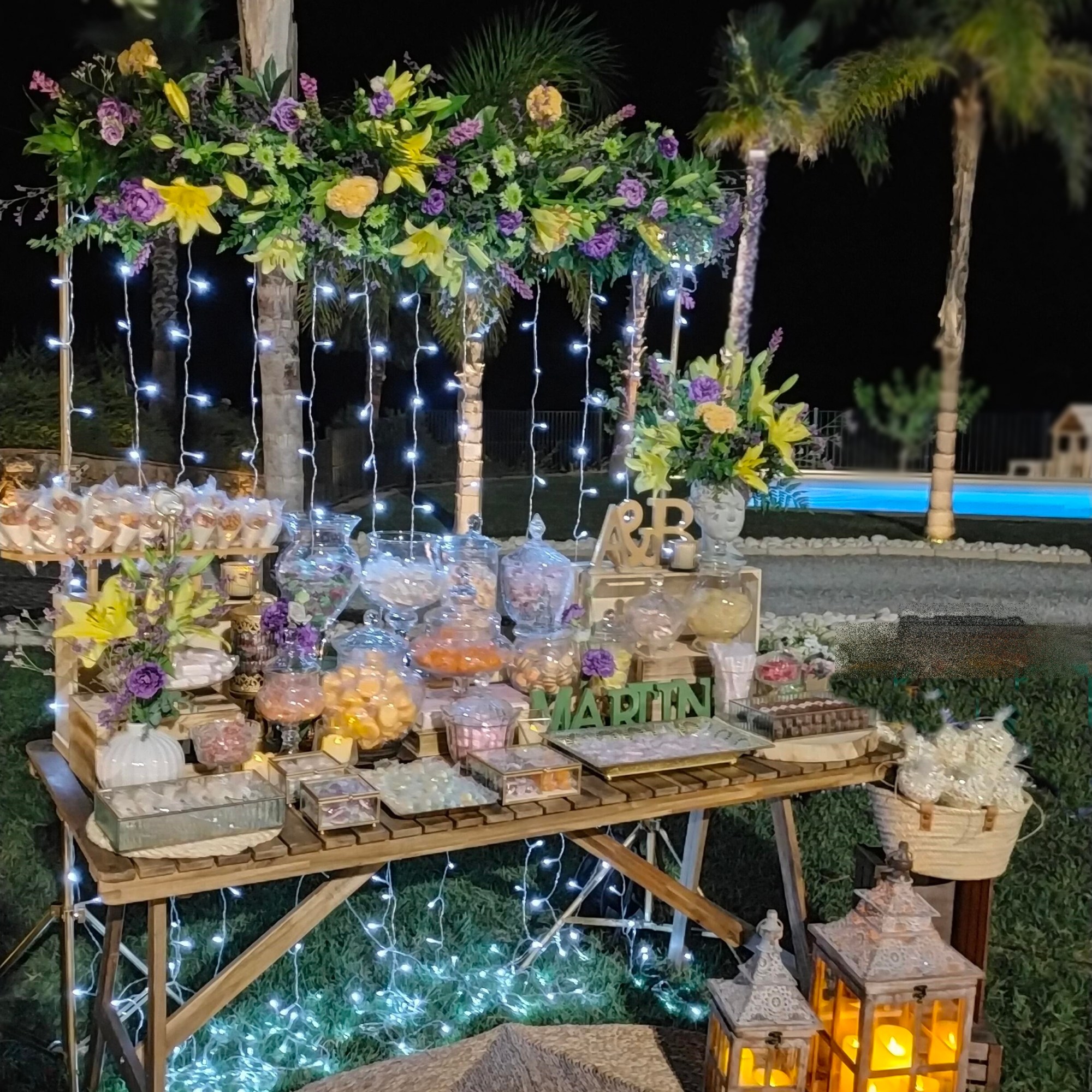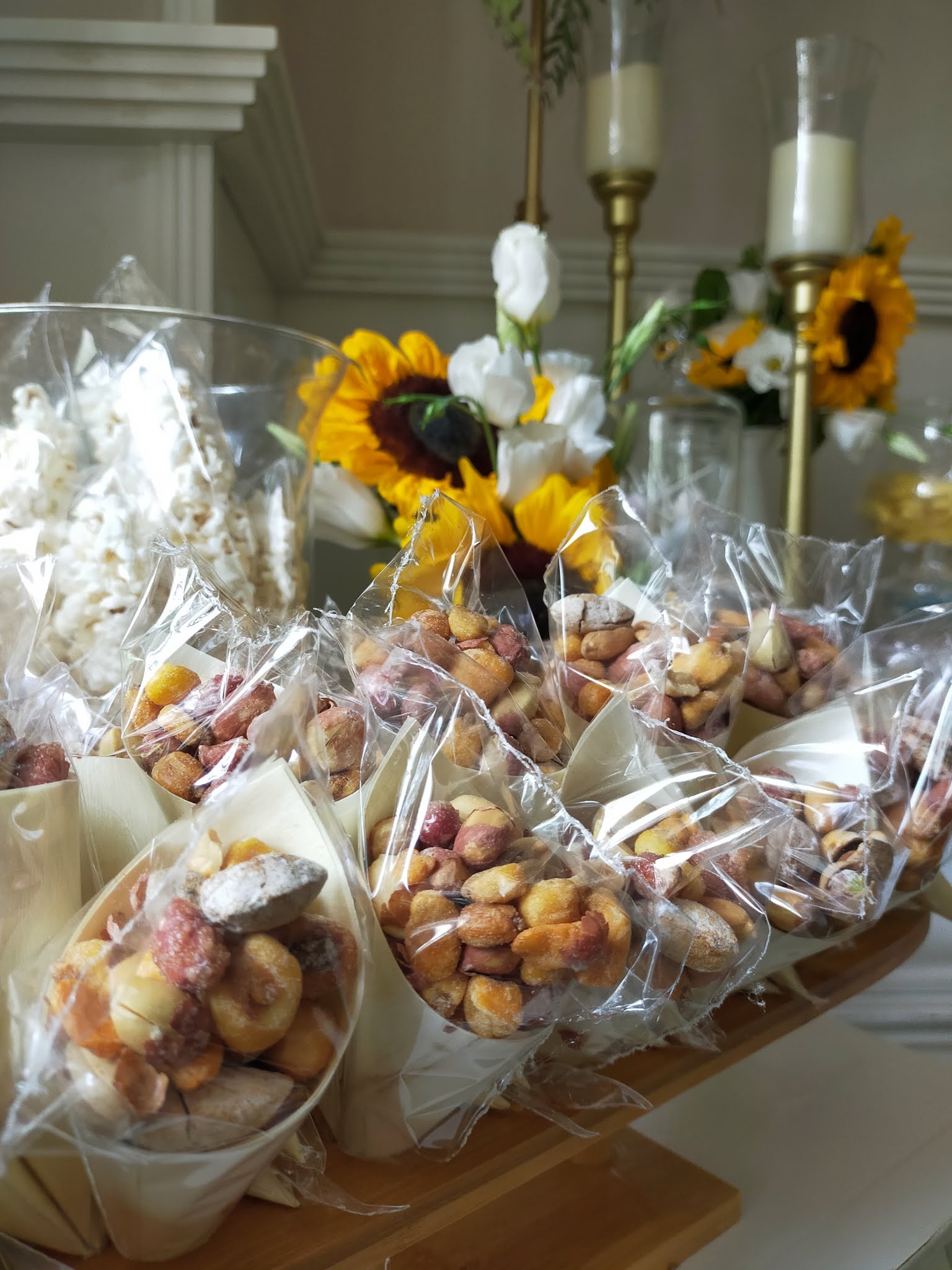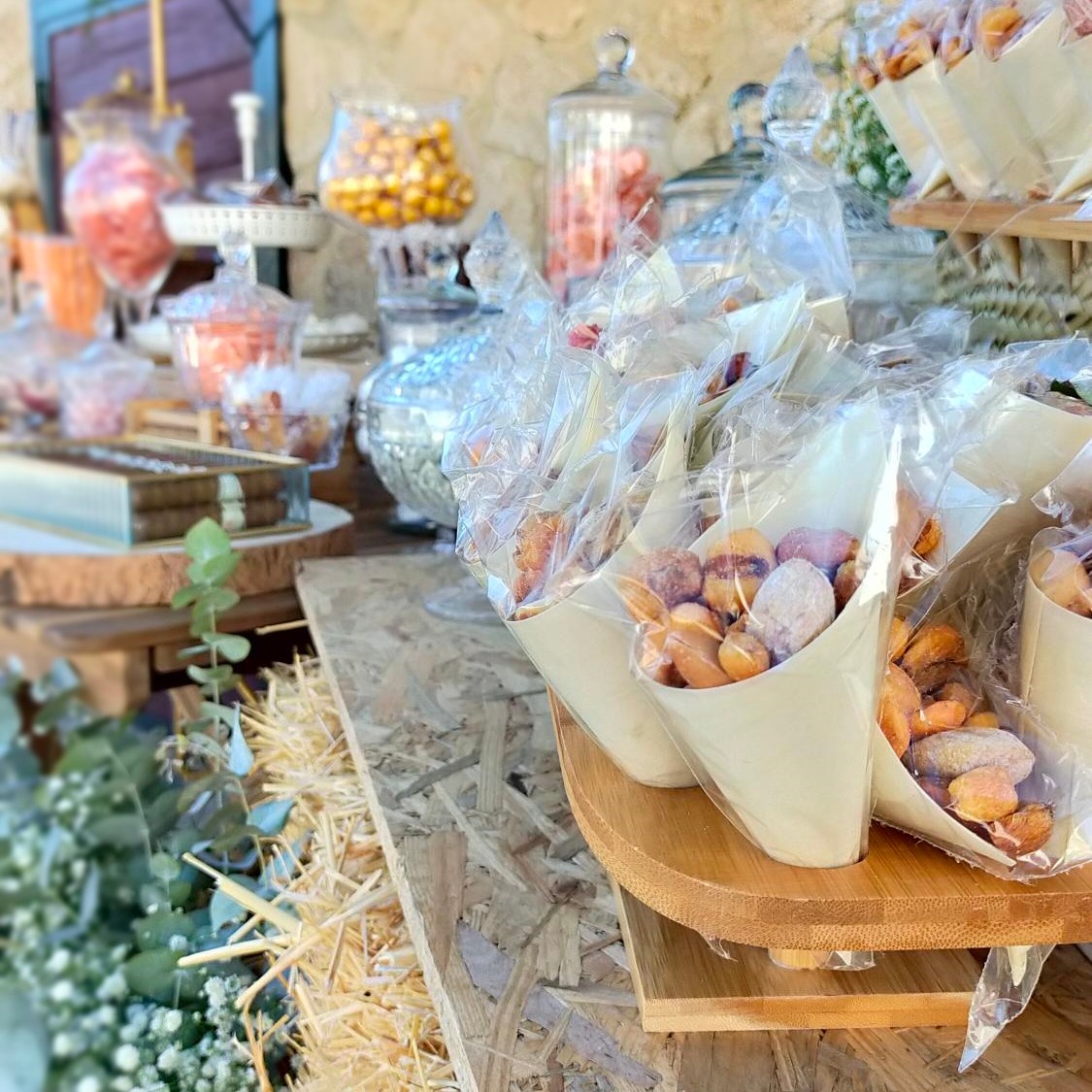 Añade frutos secos, fruta seca, pasteles…. para endulzar la fiesta en tu celebración, paquetitos de gominolas, e incluso si quieres globos o flores naturales…