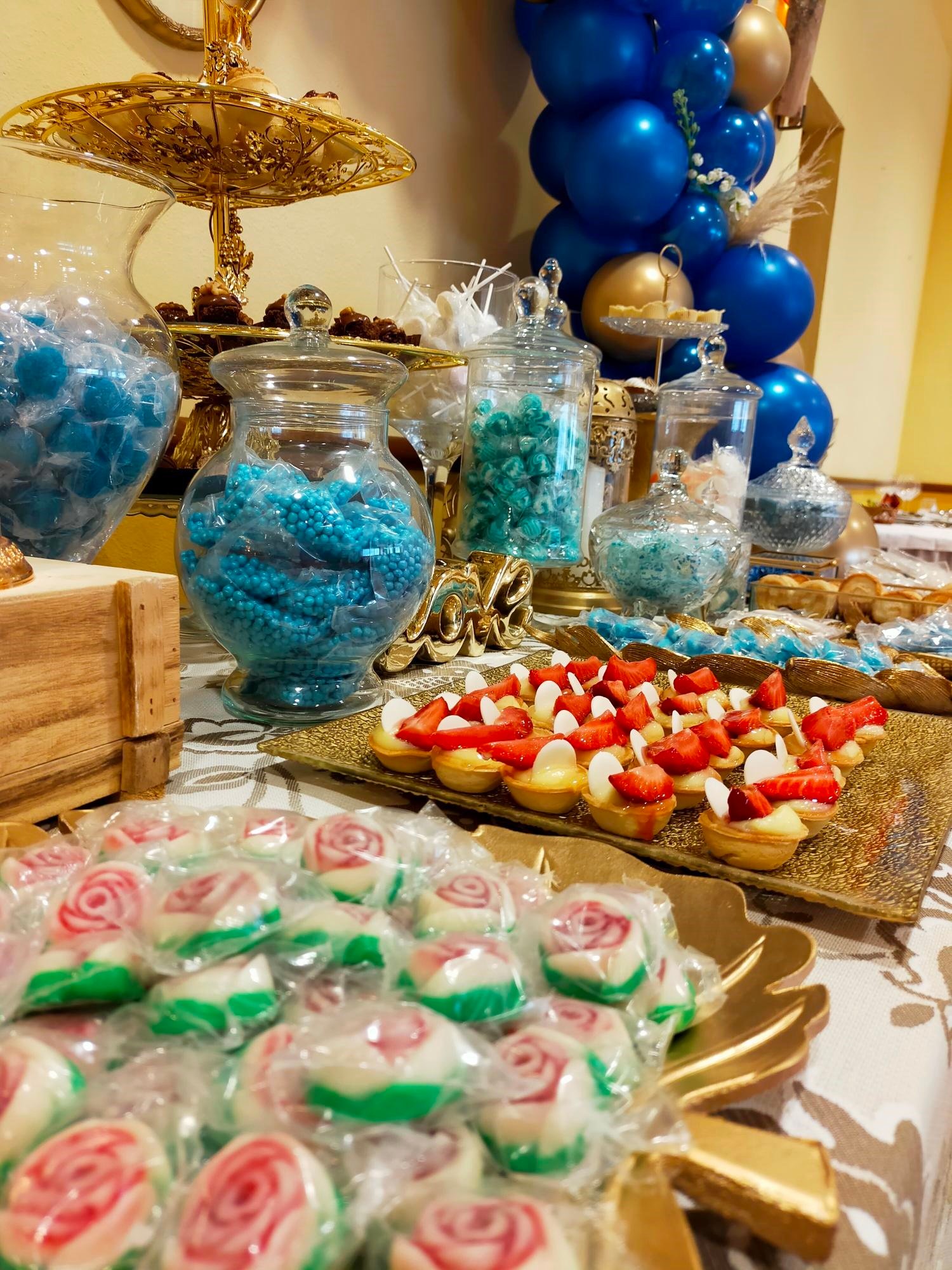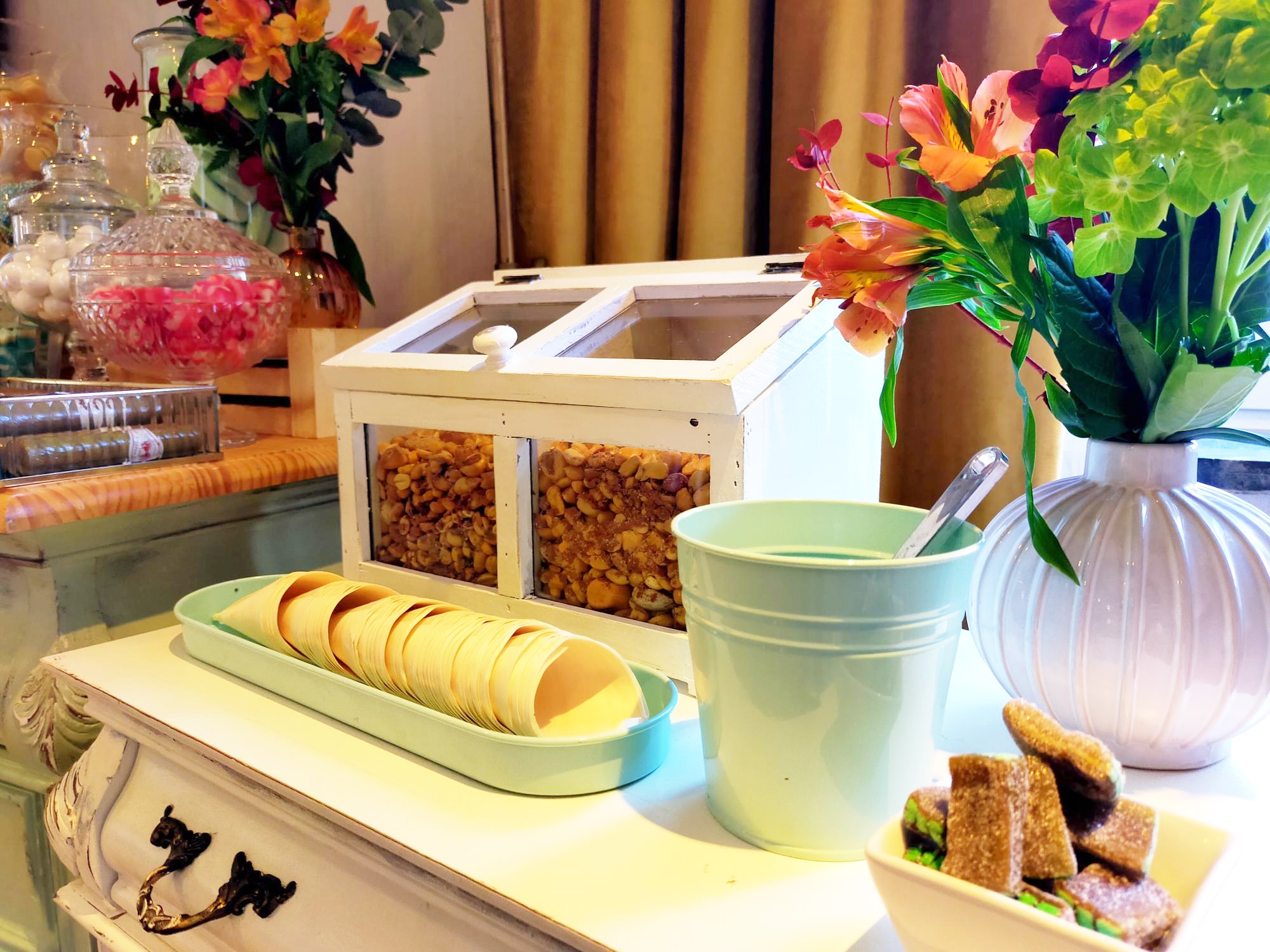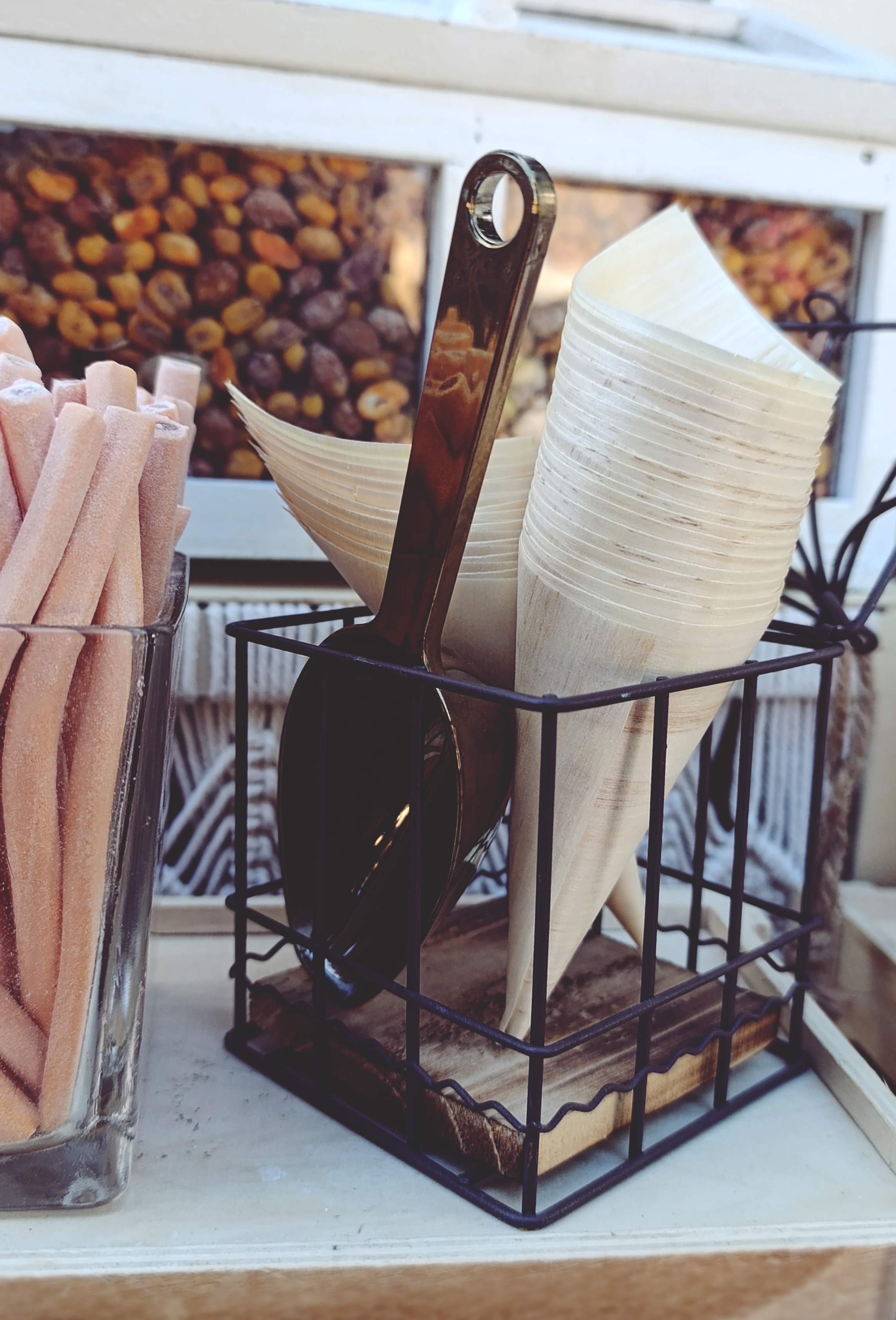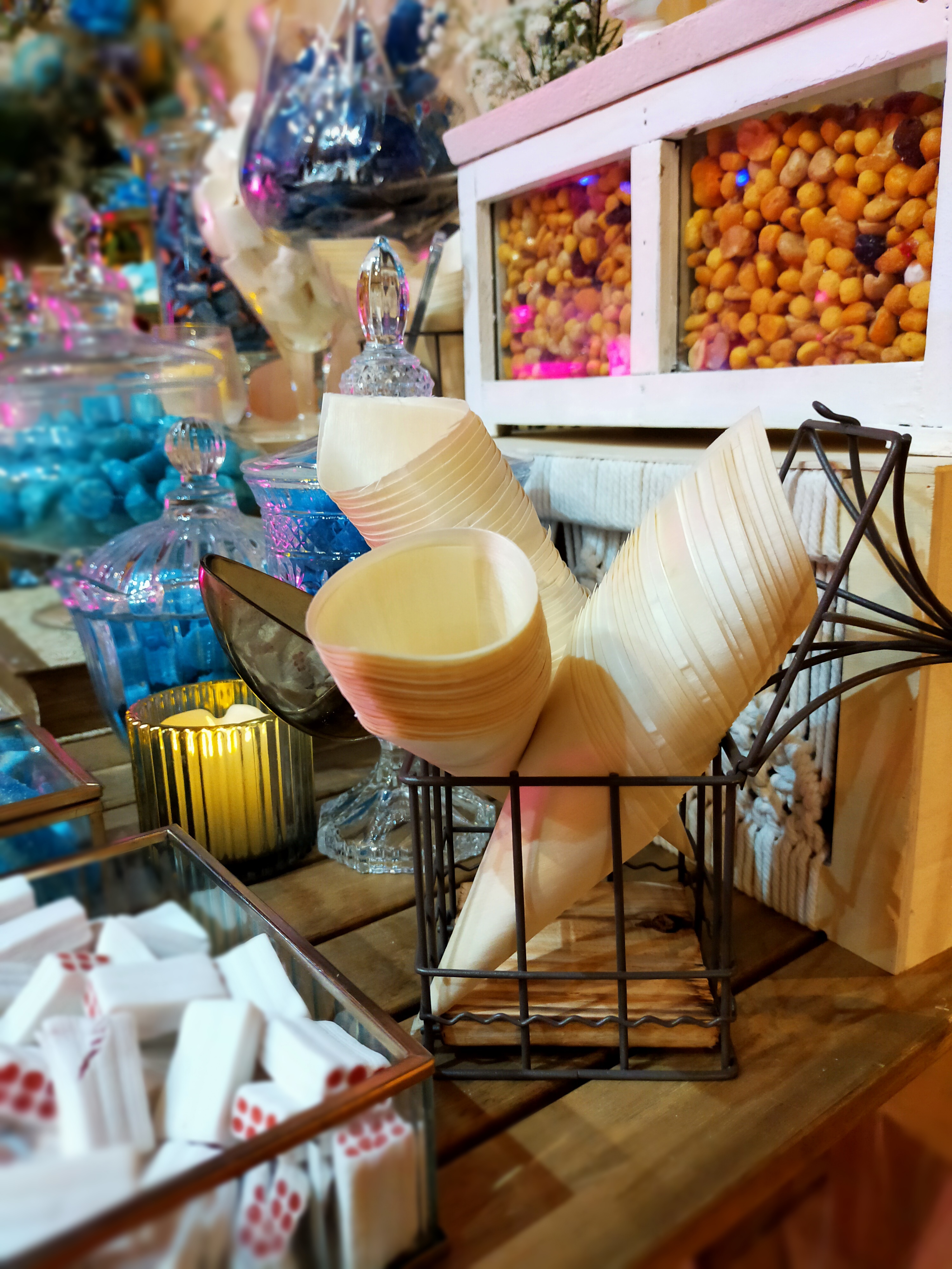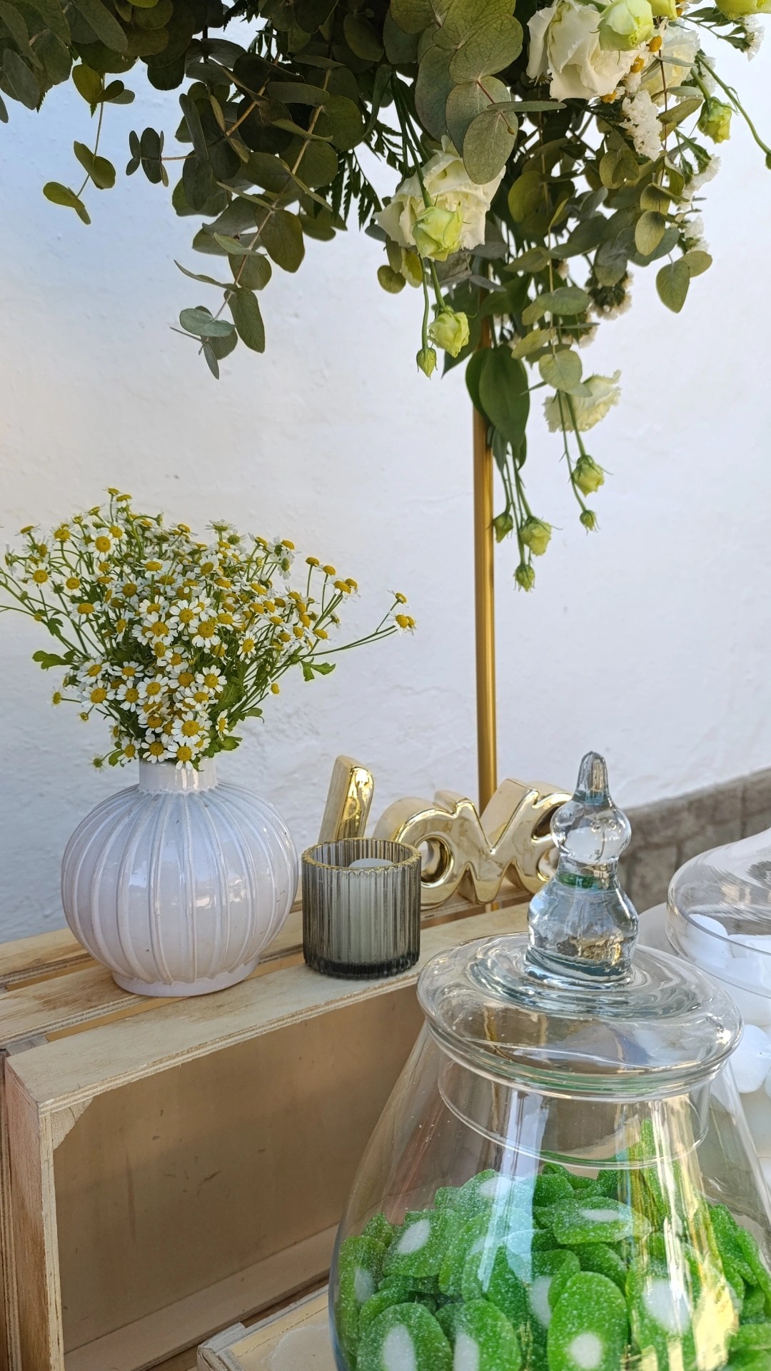 Añade frutos secos, fruta seca, pasteles…. para endulzar la fiesta en tu celebración, paquetitos de gominolas, e incluso si quieres globos o flores naturales…