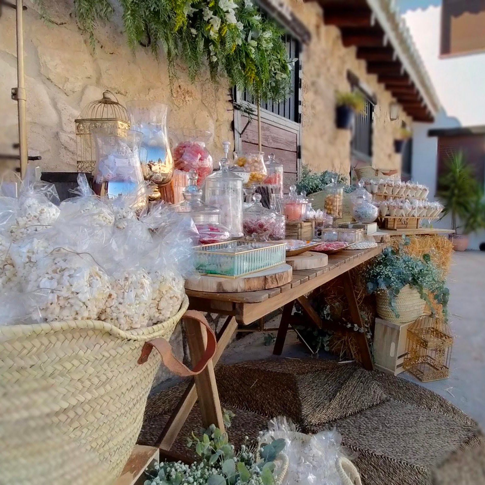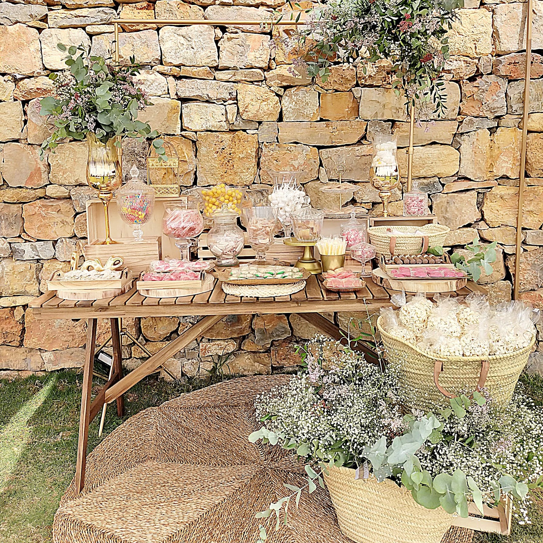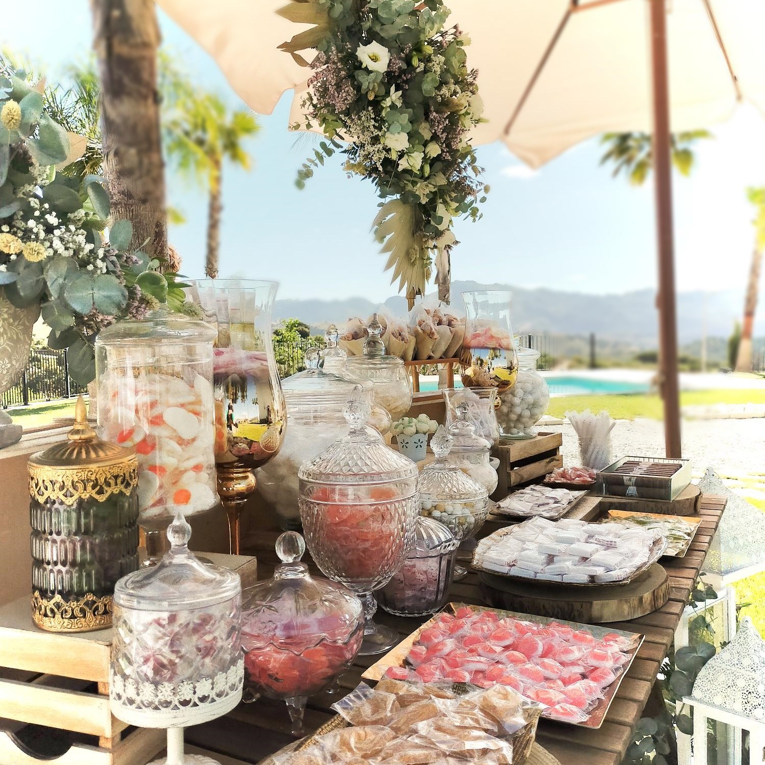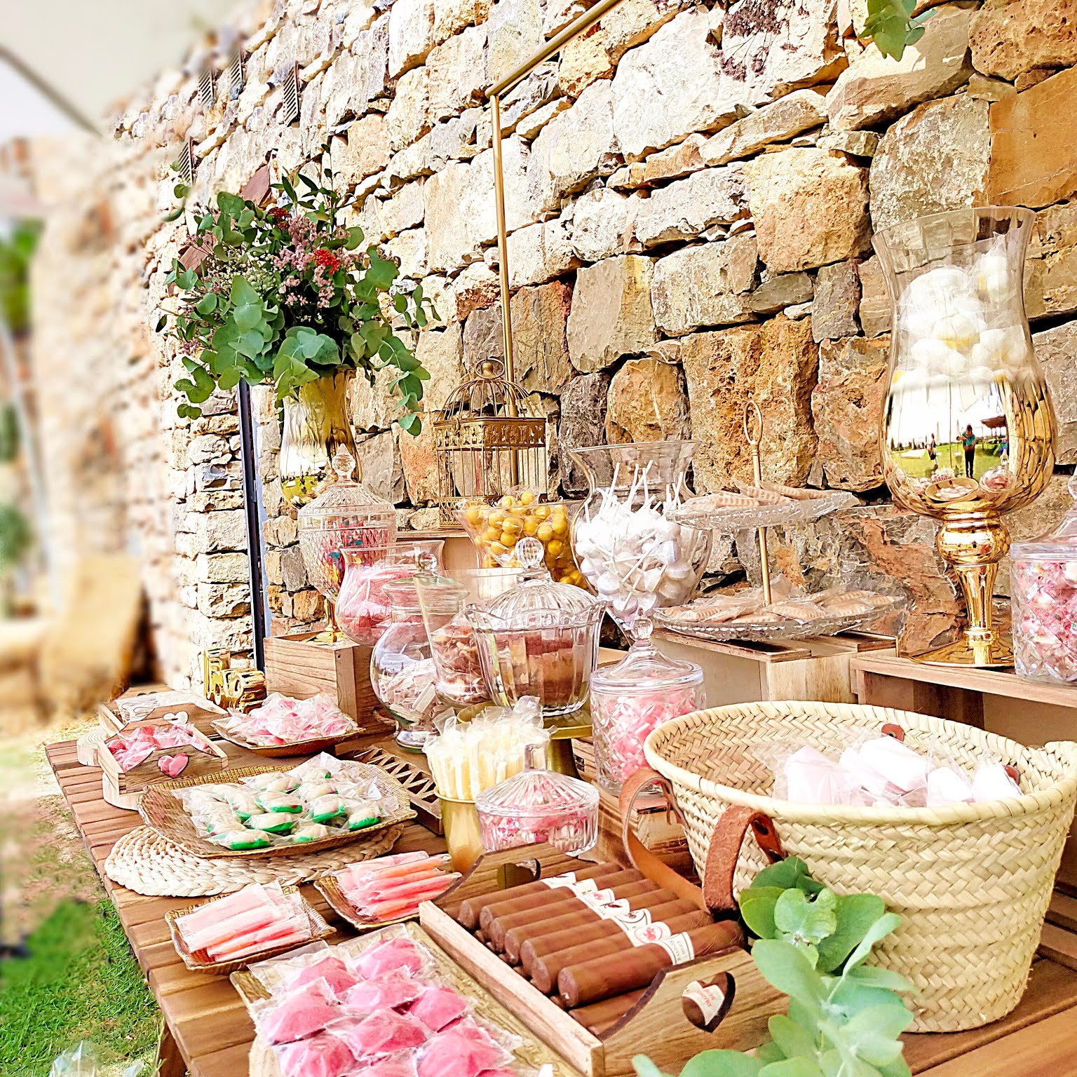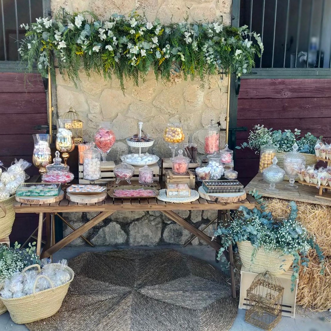 Una mesa exquisitamente decorada, a tu gusto y al estilo de todo el evento; Con una selección de gominolas, minipasteles y productos únicos, para que tus propios invitados se sirvan lo que más les guste. Es también una forma divertida de animar tu boda y un rincón imprescindible.