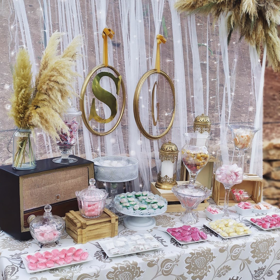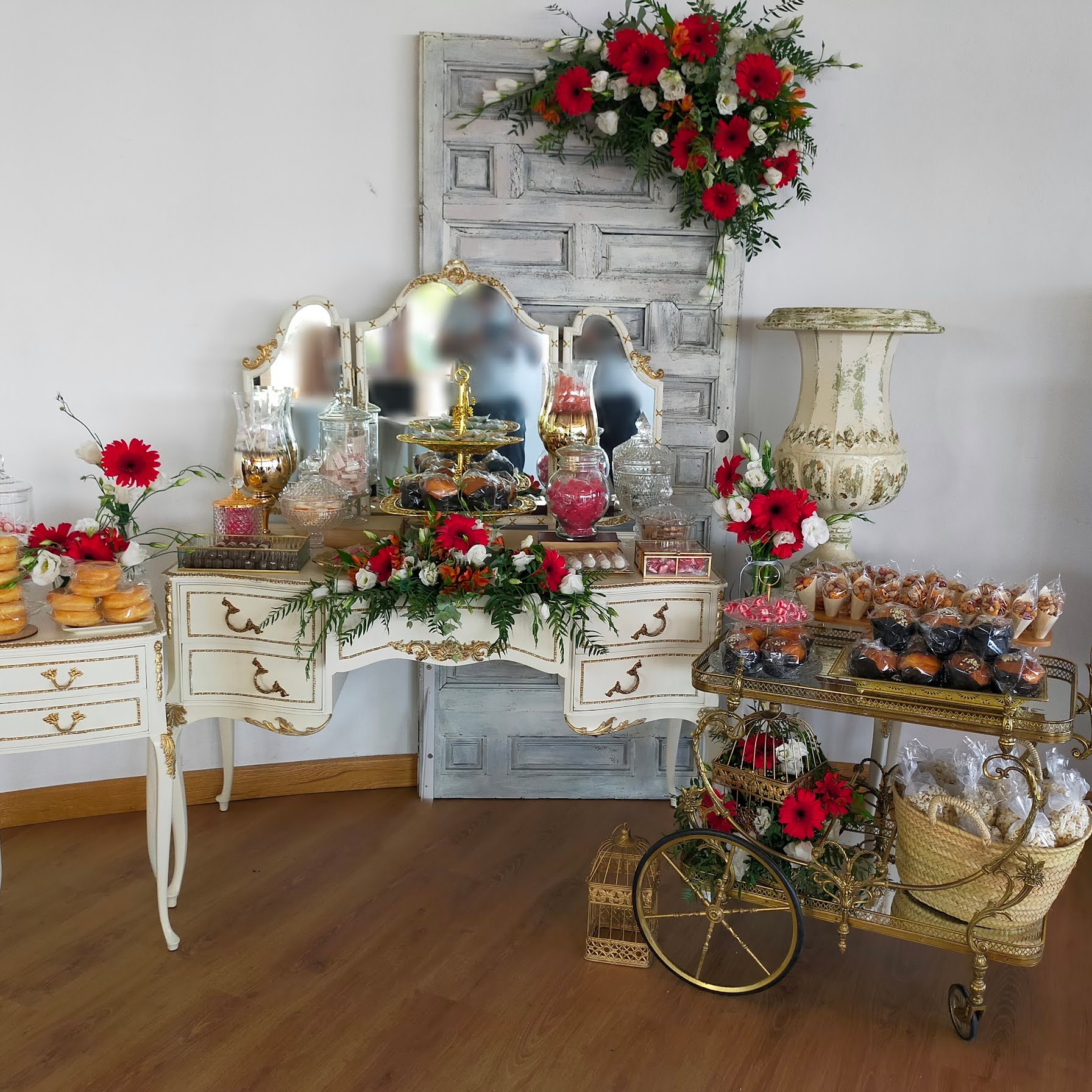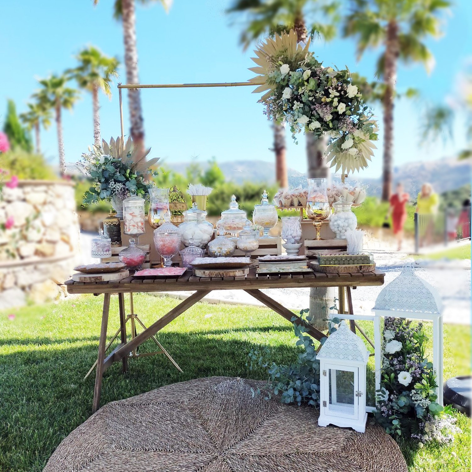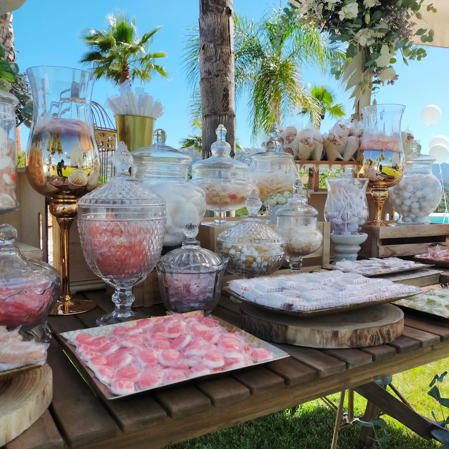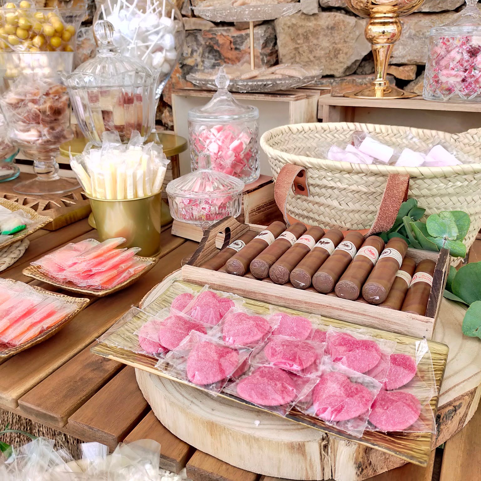 Una mesa exquisitamente decorada, a tu gusto y al estilo de todo el evento; Con una selección de gominolas, minipasteles y productos únicos, para que tus propios invitados se sirvan lo que más les guste. Es también una forma divertida de animar tu boda y un rincón imprescindible.